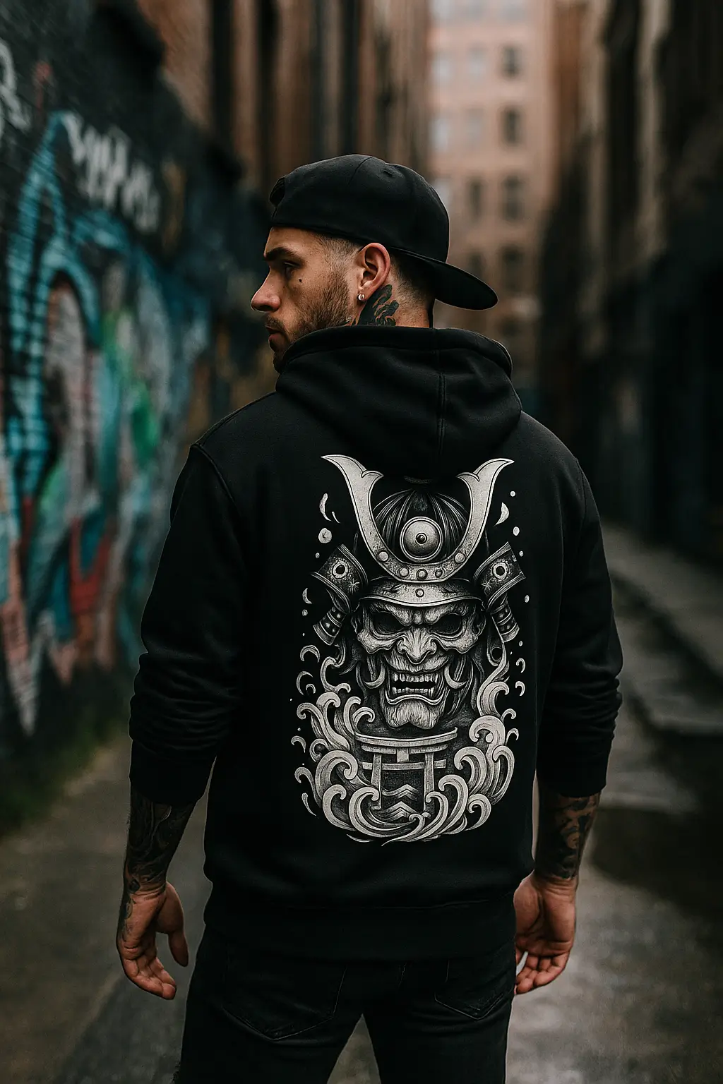 La sudadera unisex “Ronin Legacy – Black & Grey” eleva tu outfit con puro streetwear y moda urbana tattoo. En la espalda domina un samurai en estilo black & grey, con casco kabuto, máscara feroz y olas que enmarcan la escena —un guiño al tattoo japonés clásico con un acabado limpio y potente.